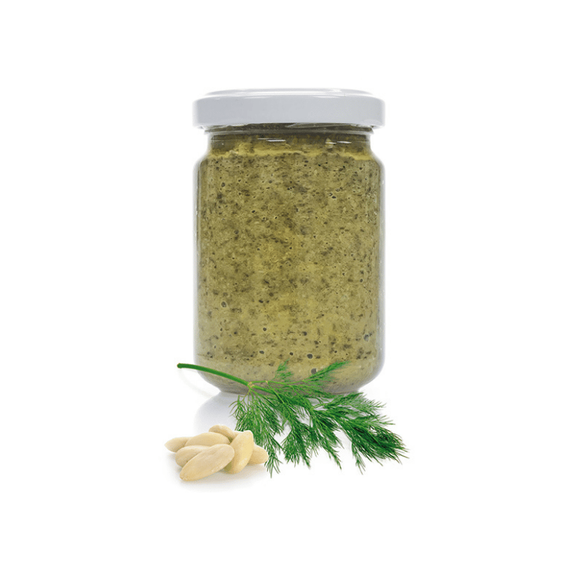 Nosso tradicional creme de endro se transforma em pesto graças à adição de amêndoas.