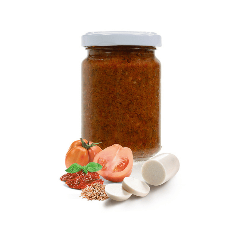 Mozzarisella®, uma preparação à base de plantas feita com brotos de arroz. A versão vegana do nosso clássico Pesto Rosso.